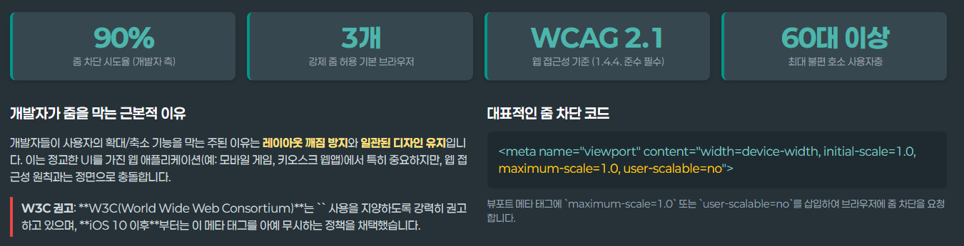 사용자가 콘텐츠를 읽고 조작할 수 있도록 화면 확대 기능을 막지 않는 것은 **WCAG (Web Content Accessibility Guidelines) 2.1** 성공 기준 1.4.4 (텍스트 크기 조절) 및 1.4.10 (리플로우) 등 주요 지침과 밀접하게 관련되어 있습니다. 줌 차단은 이 기준을 위반할 가능성이 매우 높아요!